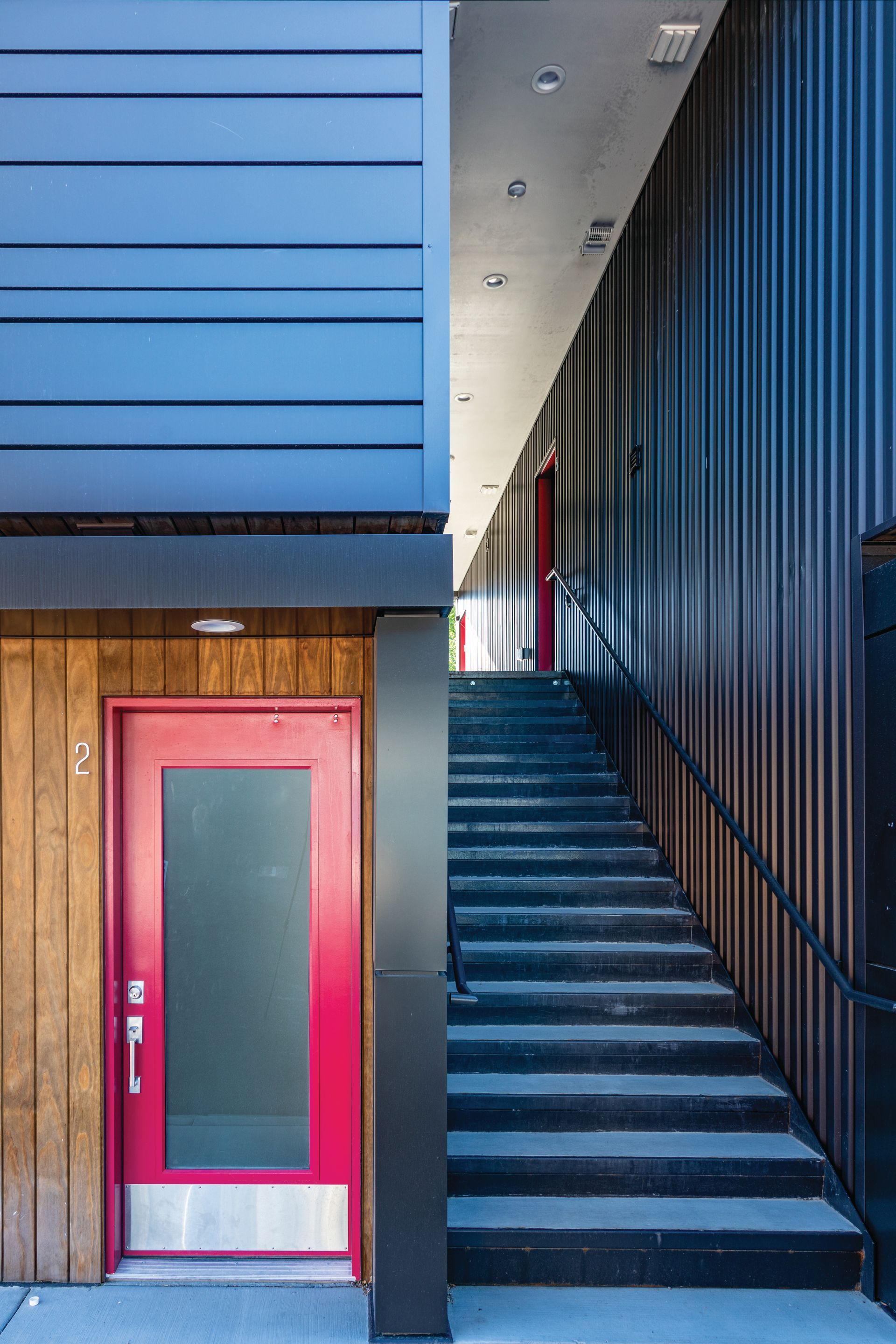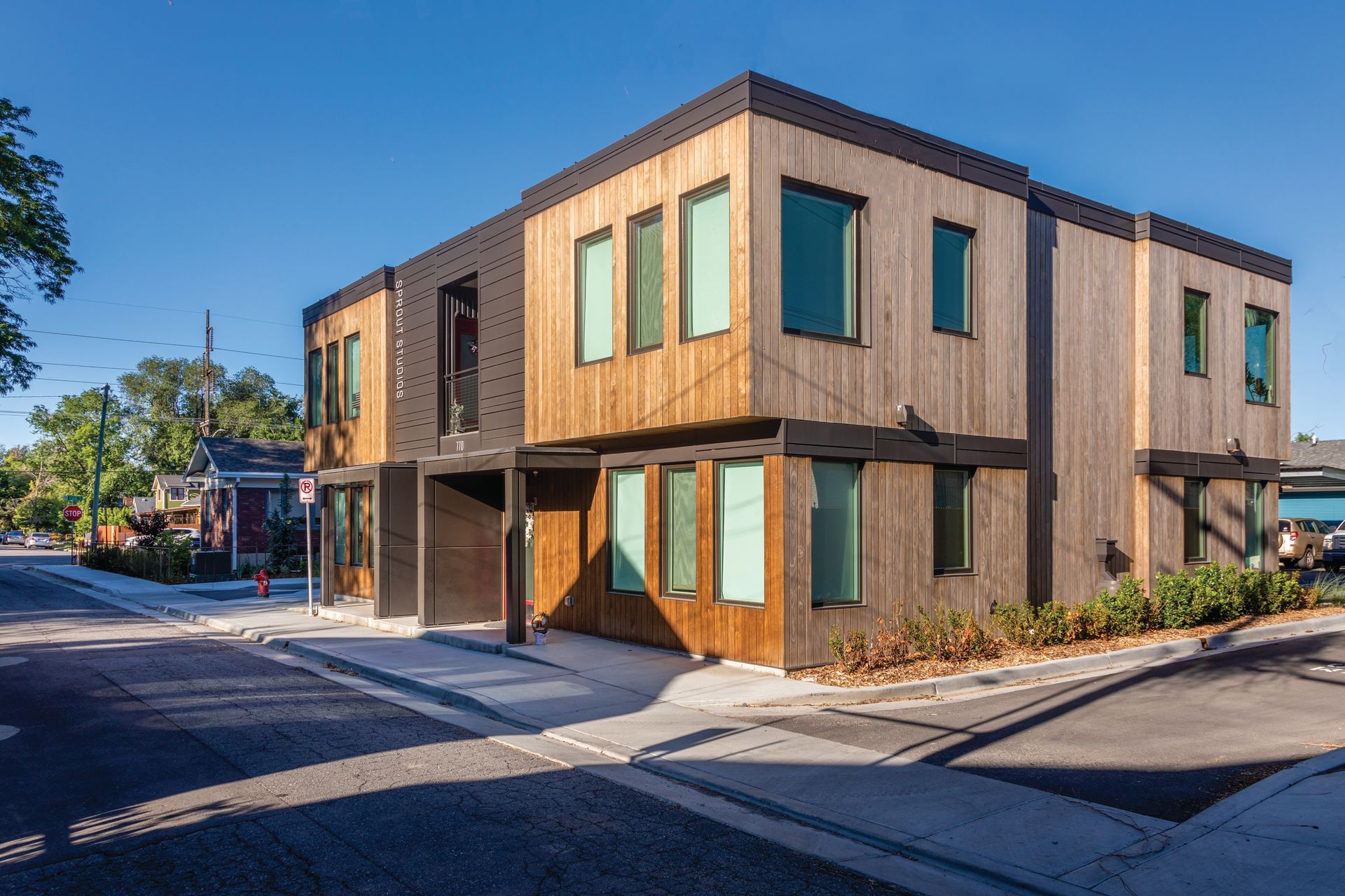 While solar panels above the parking lot shade structure cover the utility costs—totaling 45.81 MWh so far—the new eight-unit building is an example of the “missing middle” housing type so needed in Salt Lake City.