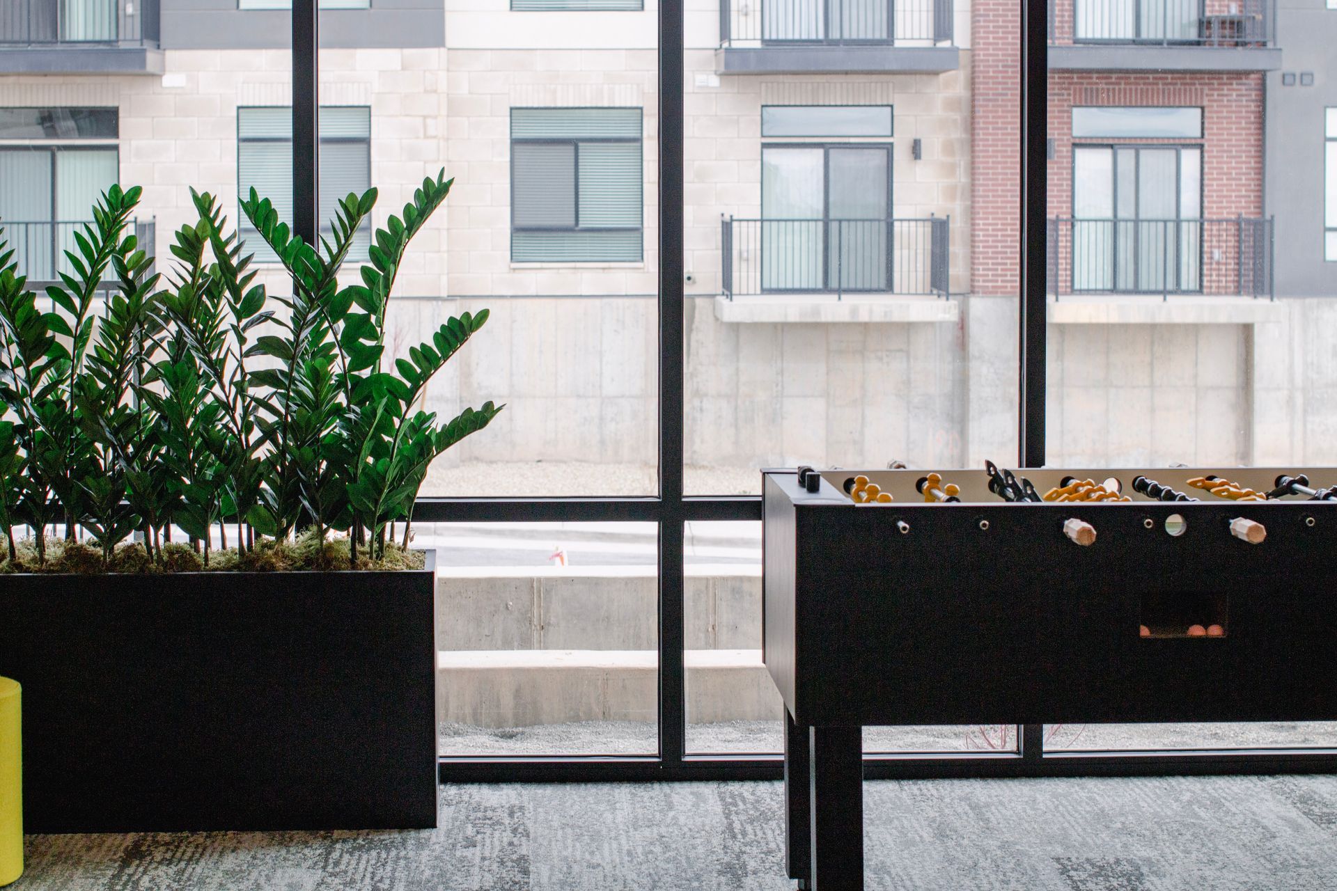 Building two (84,600 SF) includes an impressive fitness room with mirrored walls and storefront for an open, airy feeling, plus a movie theater room with custom cabinetry and built-in banquet seating, a conference room, and a game room with shuffleboard, foosball, and two gaming consoles.