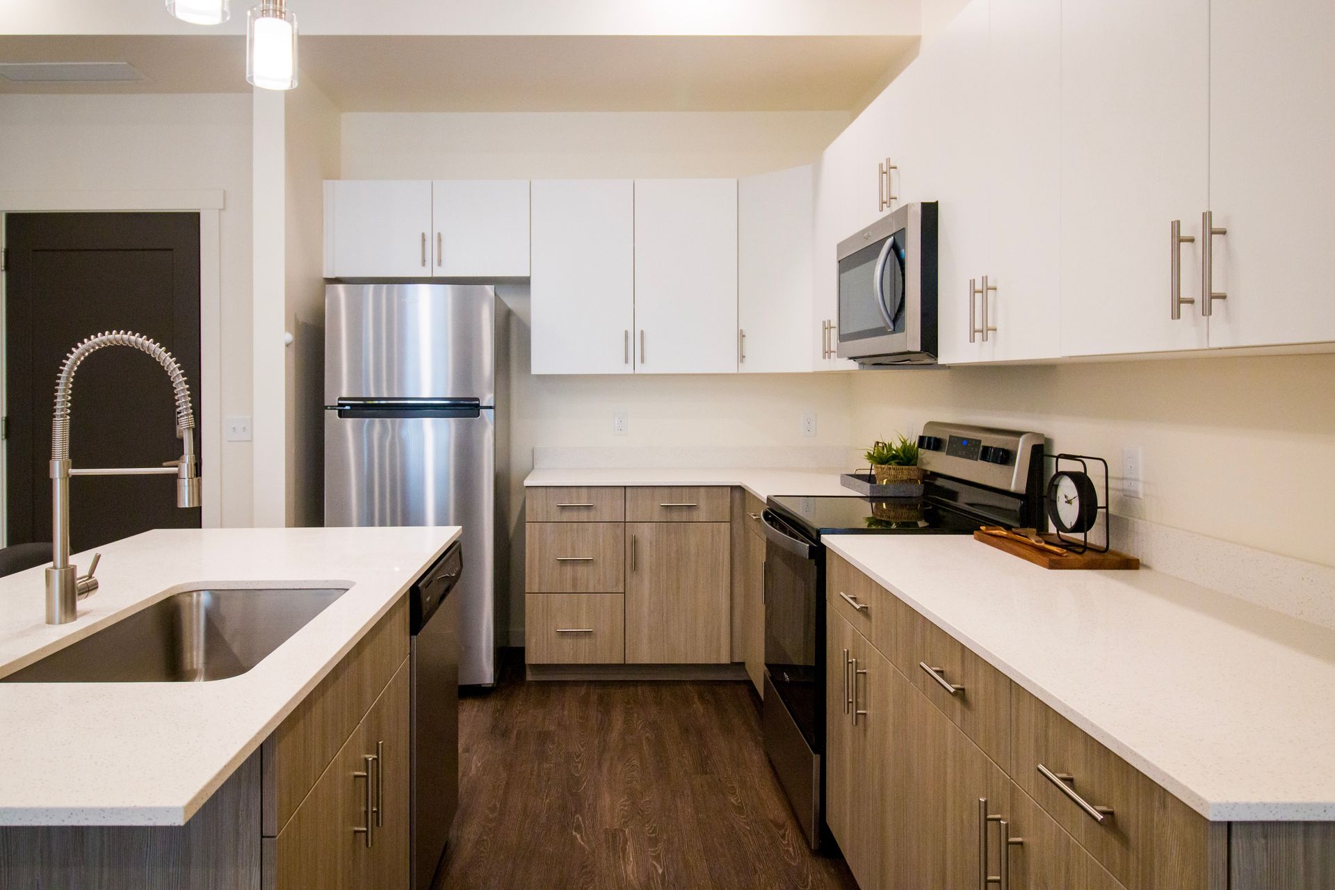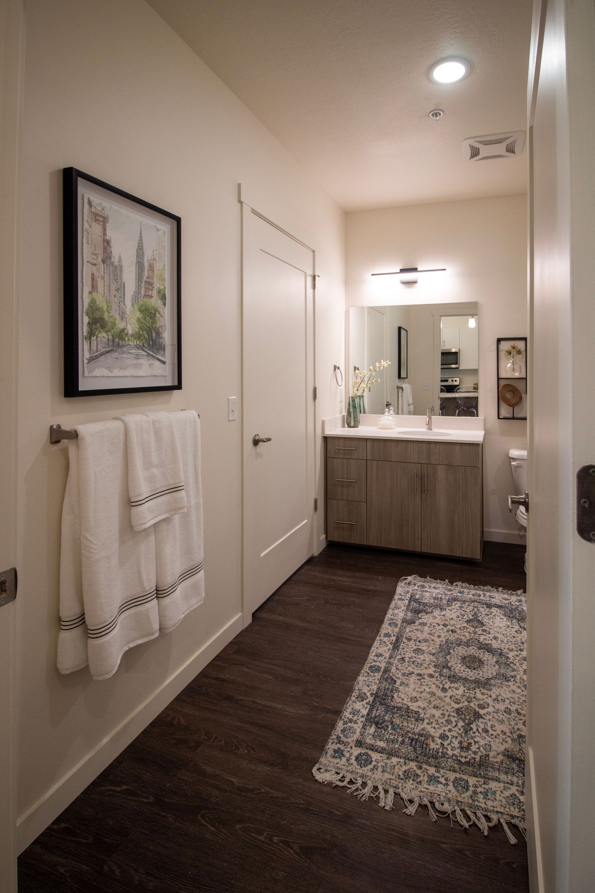 The clubroom offers a little bit of everything: a kitchen with slick tile backsplash and custom shelving; a pool table with tile inset floor coverings; a cozy fireplace seating area. The pool deck offers a spacious 50 x 30 ft. swimming pool with oversize spa and waterfall features; it also has an outdoor fireplace and kitchen with state-of-the-art grilling stations. Tenants have access to spacious storage rooms which include bicycle repair stations and workbenches and a dog wash station.