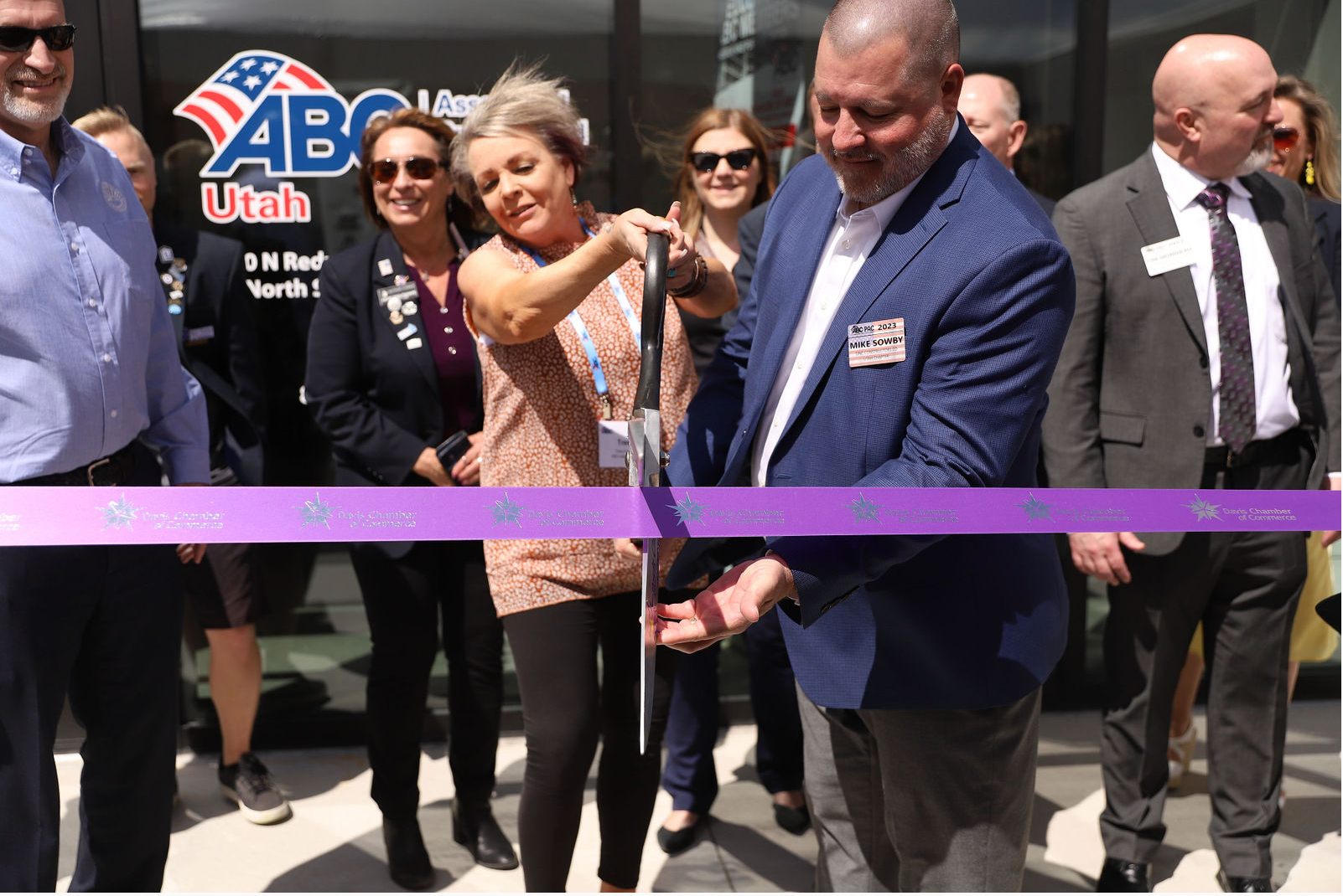 ABC Utah’s new President/CEO Tresa Folkman wields giant scissors next to Immediate Past Chair Mike Sowby