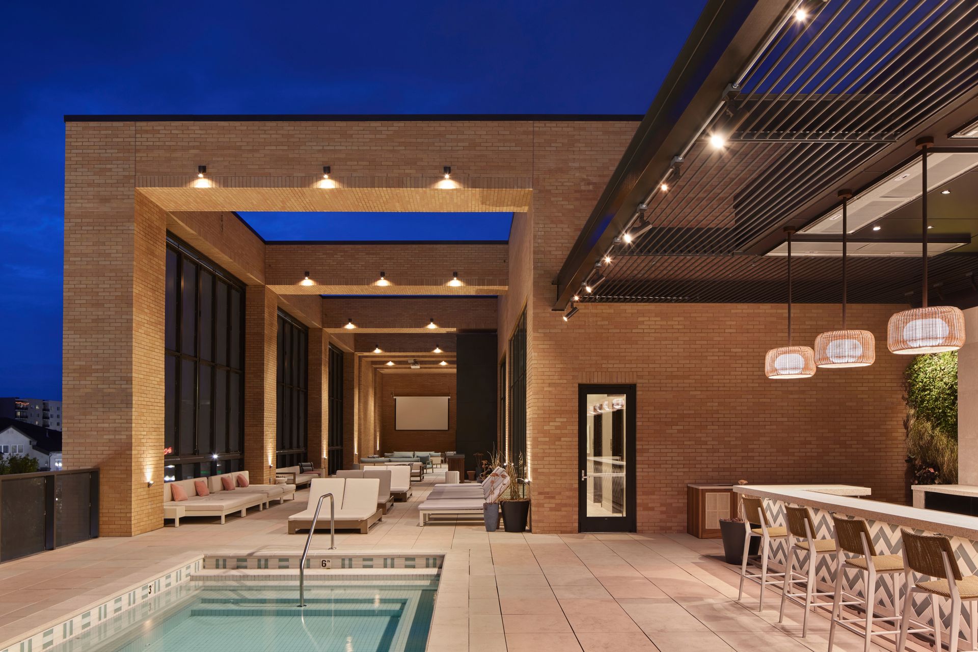 The entertainment program is balanced by a two-story wellness center with private lockers, showers, and saunas. Entertainment and wellness spaces merge at the rooftop terrace, where an outdoor pool and bar connect with a multi-purpose event space.