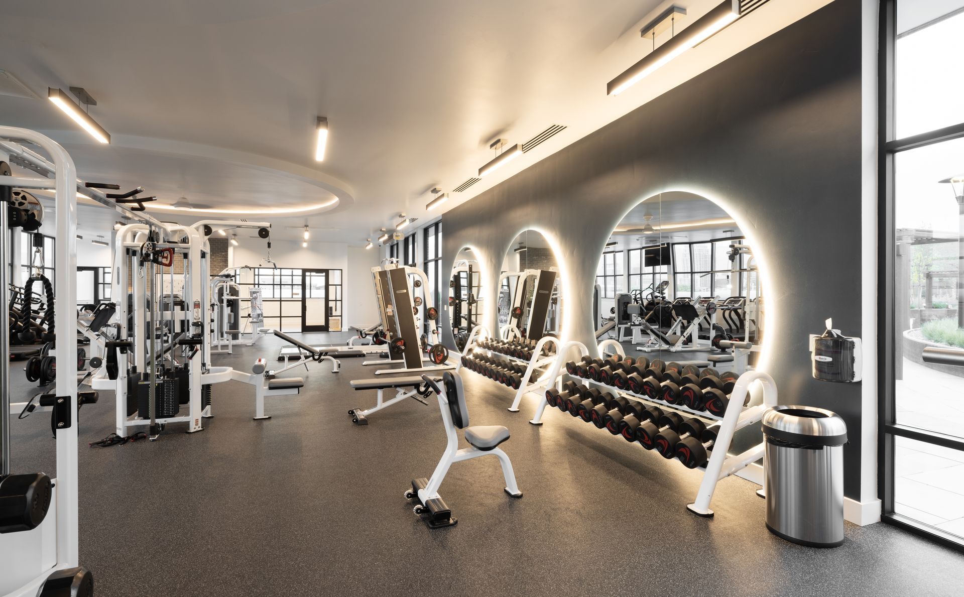 Building amenities continue toward the eighth-floor amenity deck. There is indoor/outdoor co-working space for the studious and a 4,000-SF gym with the free weights, machines, and more for the active—with stellar views out to the capitol from massive floor to ceiling windows. The indoor portion even includes a golf simulator, two-lane bowling alley, arcade machines, and table shuffleboard for those looking to unwind.