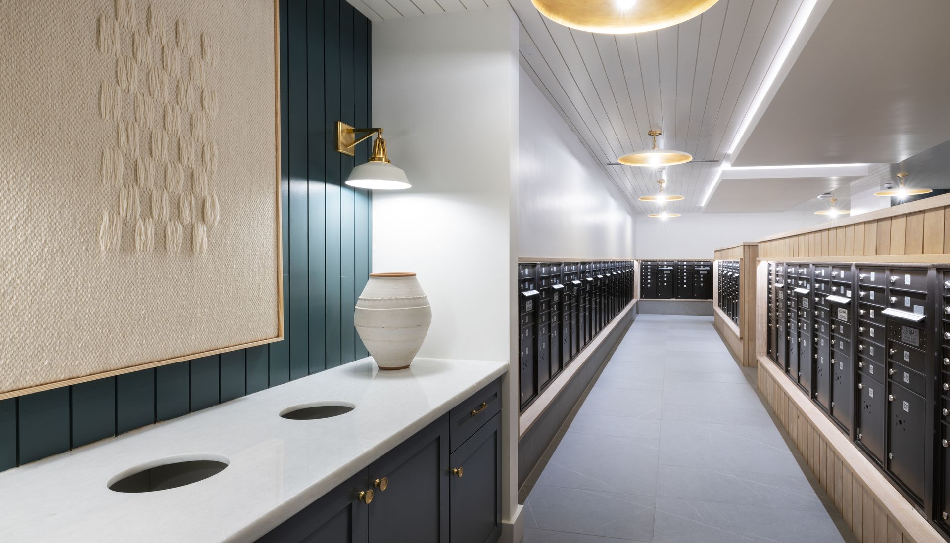 Sleek features are present in the interior amenity spaces, with high-end finishes and furniture in the mail room (left) on the ground floor, as well as the spacious and well-lit rooftop gym (right).