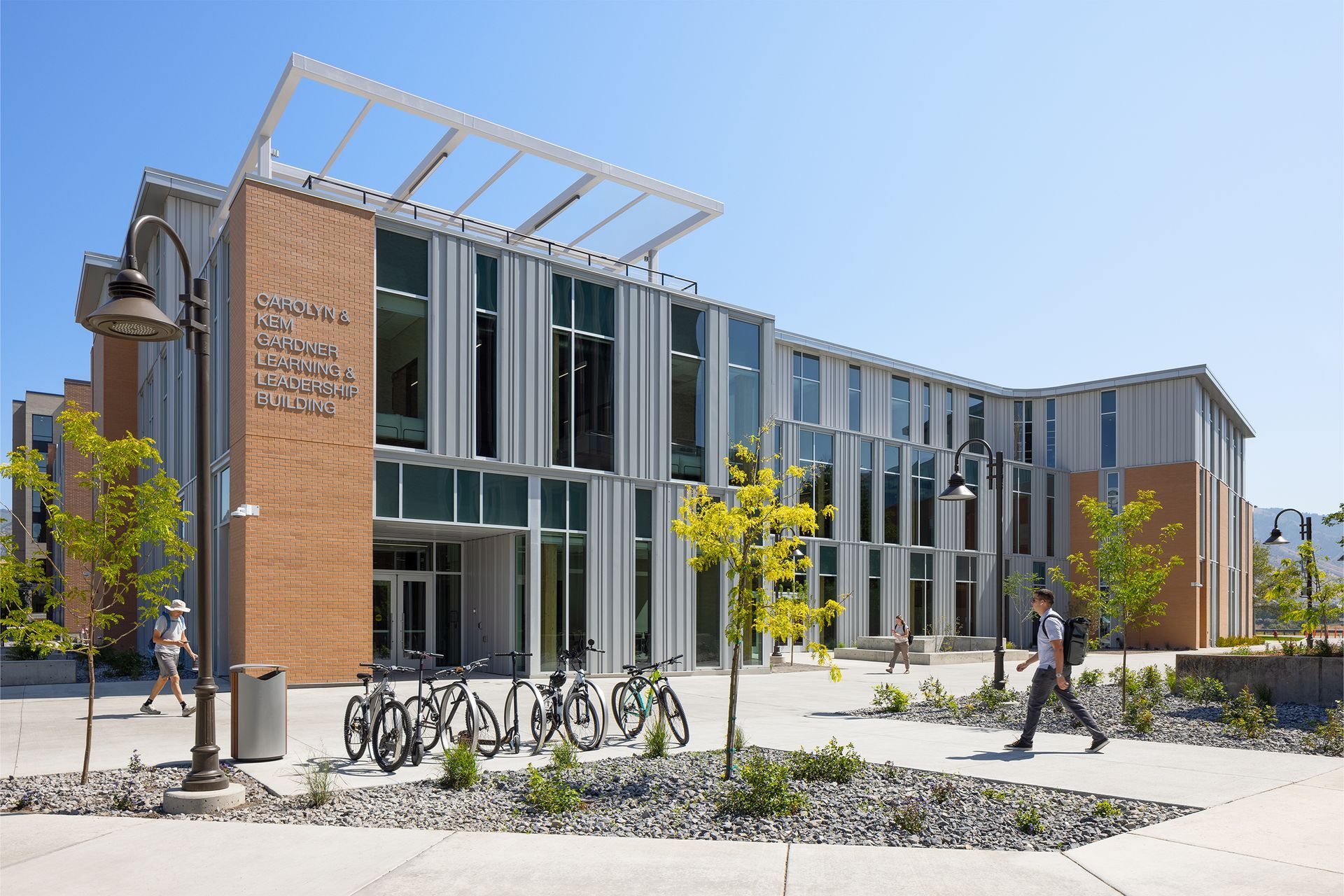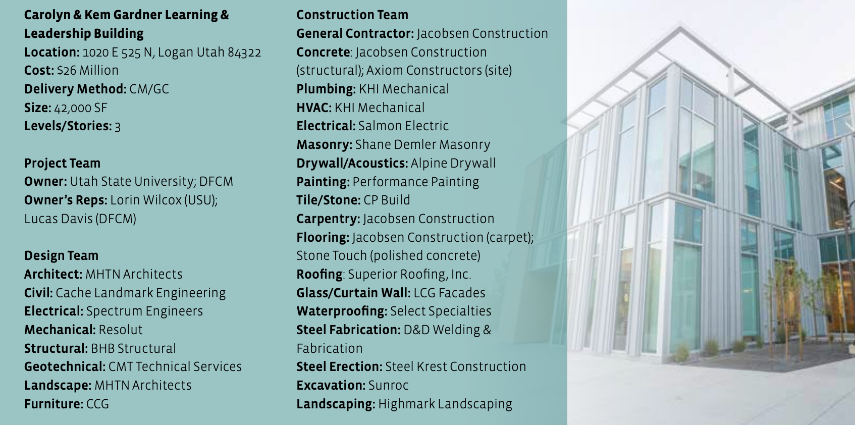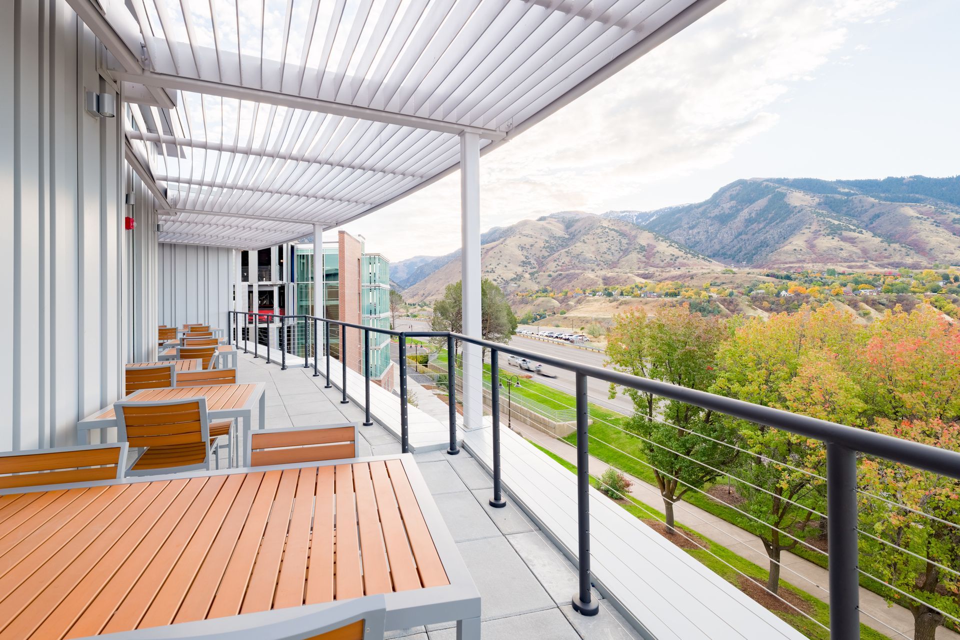 The large balcony (pictured left) on the third level overlooks Logan Canyon, connecting students and faculty to the beauty surrounding the Utah State University campus. The Gardner Building required stellar coordination between design and construction teams to deliver its unique exterior of metal paneling, glazing, and masonry elements (right, both images courtesy USU).