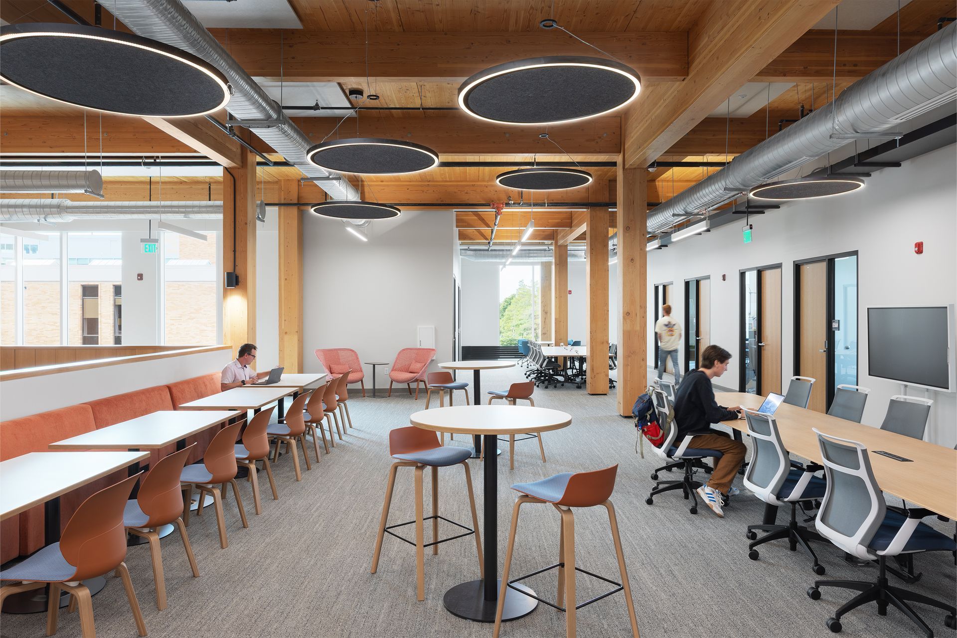 USU chose a hybrid design, with mass timber accounting for 40% of the building in front-facing and gathering spaces. The remaining 60% would be a steel structure for a differentiated experience for the project team and those who would eventually use it.
