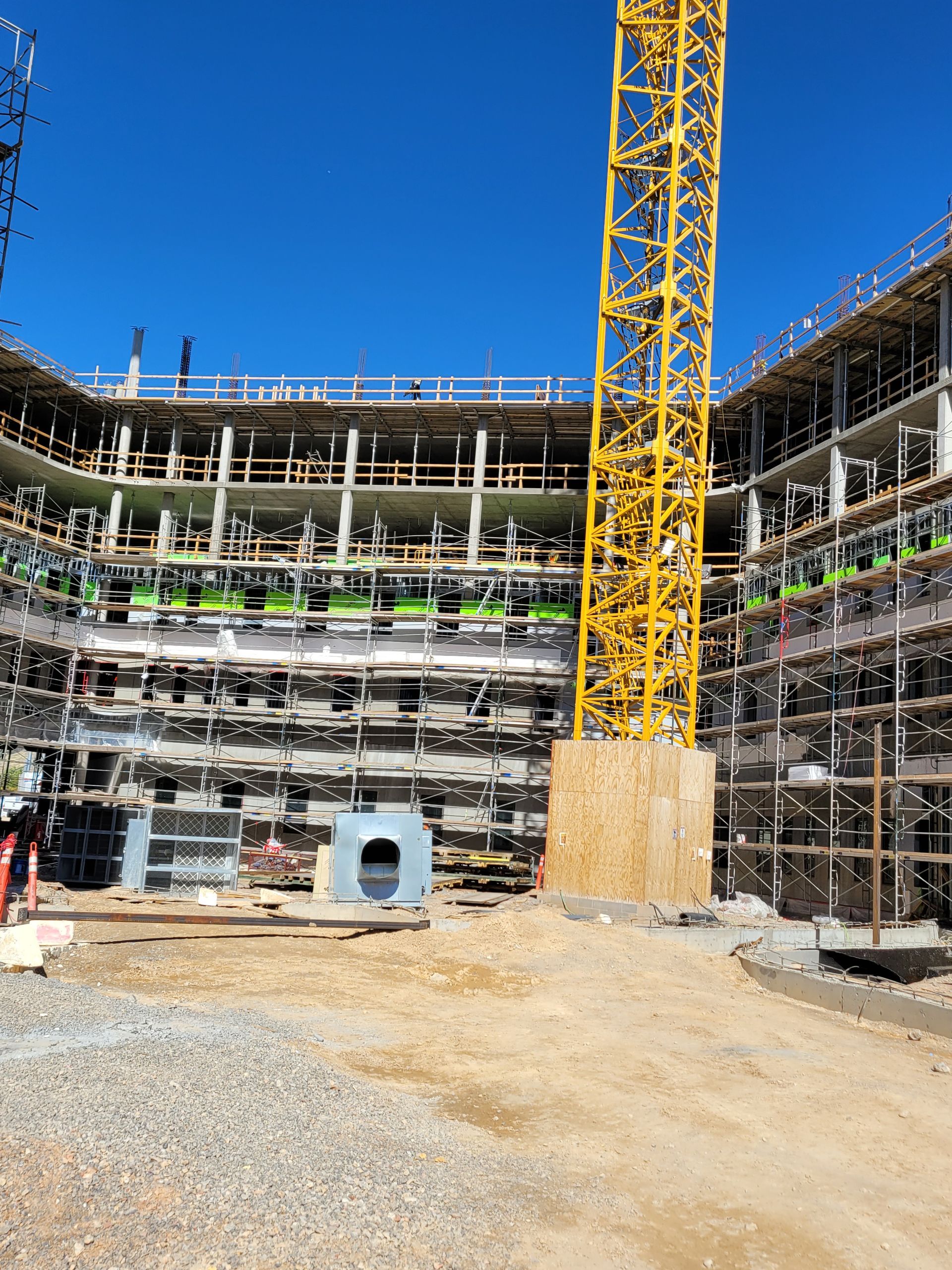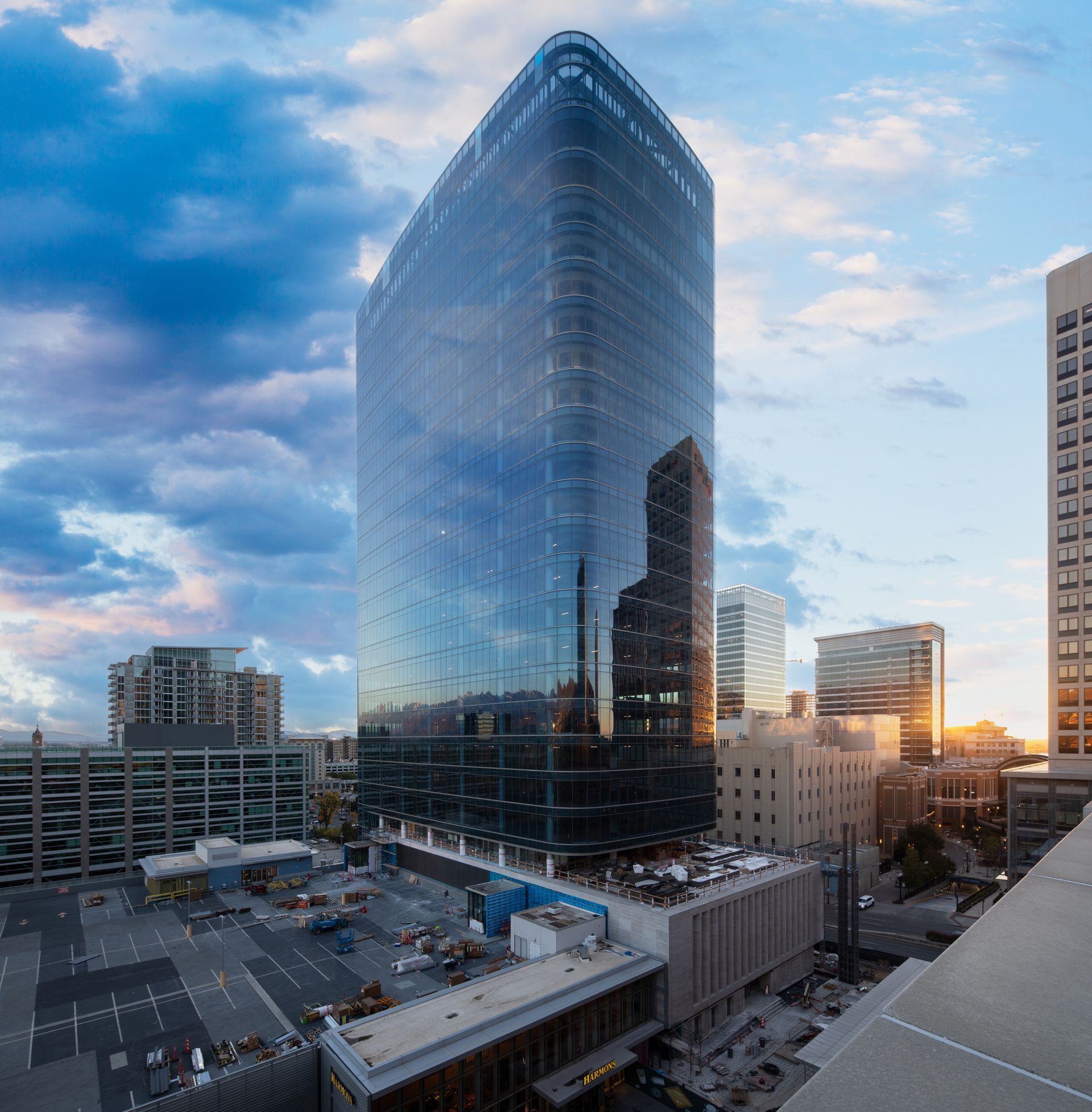Mollerup Glass is another building envelope contractor with a stellar reputation for delivering top-notch glazing work. Their work on the U of U Impact & Prosperity Epicenter included creating custom splayed mullions and “pre-glazing” and installing 1,000 operable windows across the curvature-heavy project (pictured during and after construction, courtesy Mollerup Glass)