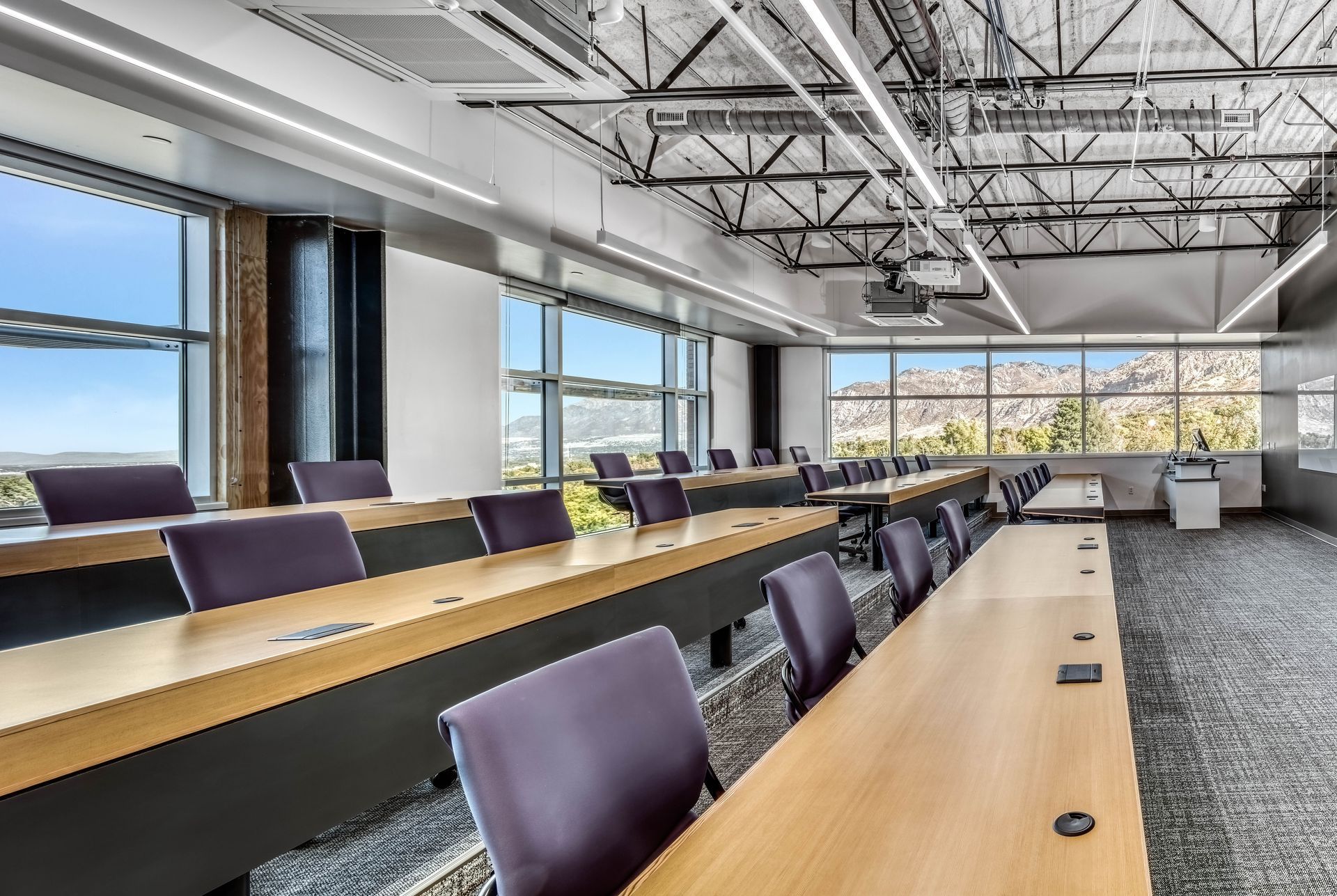 Flex labs, computer labs, maker spaces, and professor offices are all present, along with rare spaces like a microscopy suite, with its ISO 8 cleanroom filtration system. Top floor classrooms for computer science and sales come with conference rooms and interview rooms, which allow every department in the building to function at the highest level. Classrooms and lab spaces throughout the building are geared for flexibility, with even computer labs opening up via removable walls to create bigger classrooms.