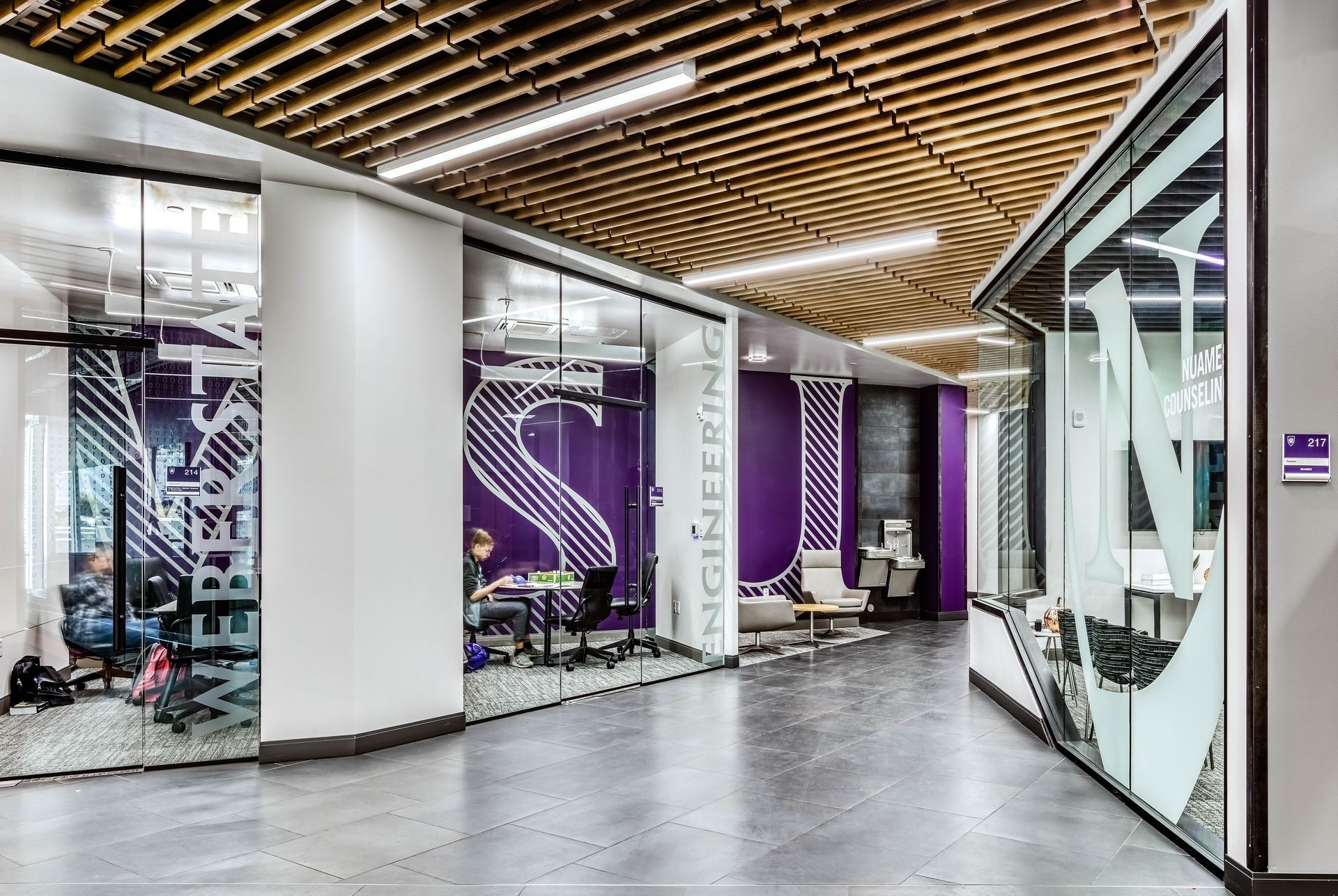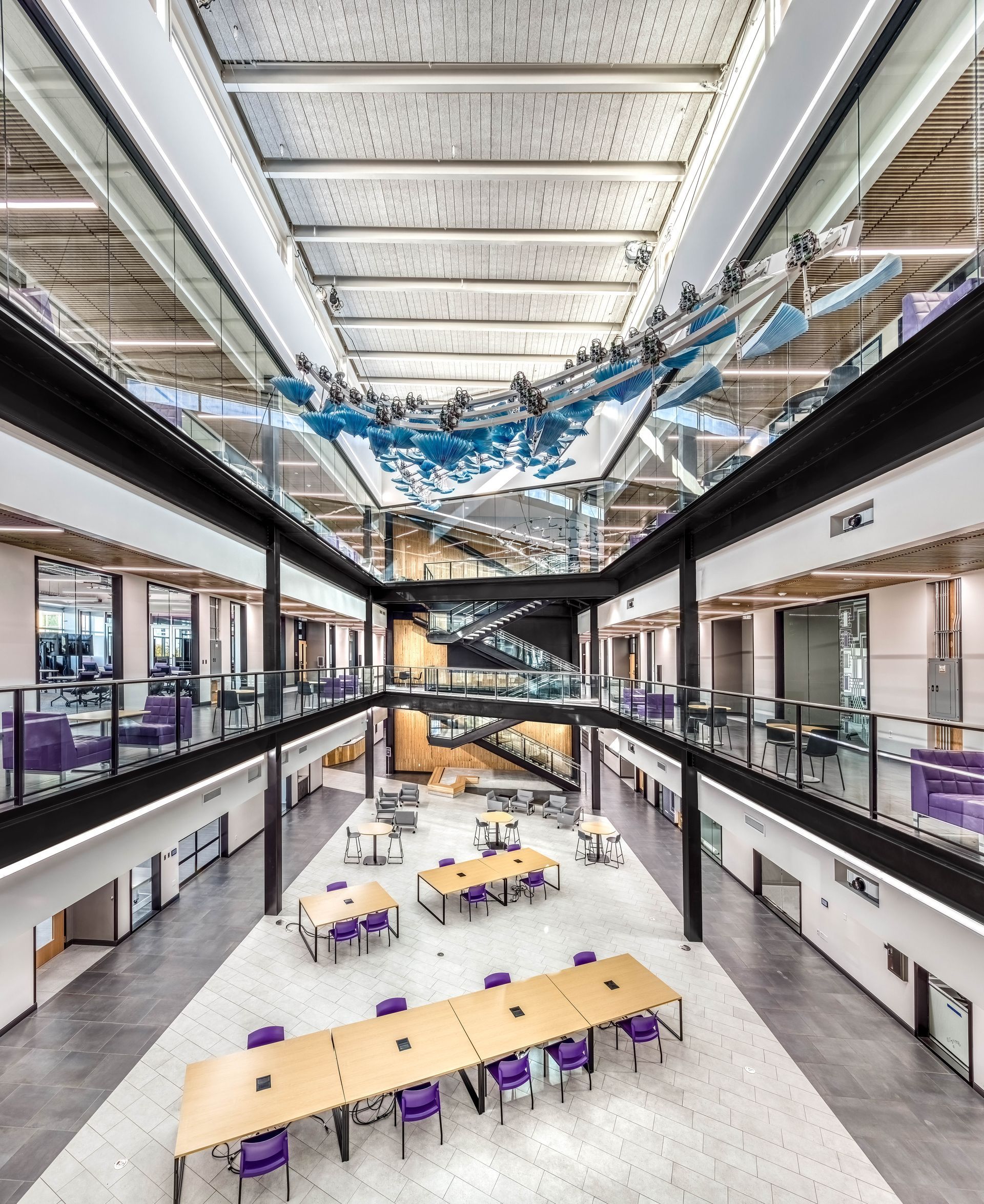 The main floor bustles with students moving in and out of classrooms and through the interior forum. Balconies on the upper floors add a kinetic feel to the interior, a sea change from the stuffy engineering buildings of decades prior. Labs on both sides are separated from the forum by hallway runs with “finished,” wood slat ceilings framed by black steel.