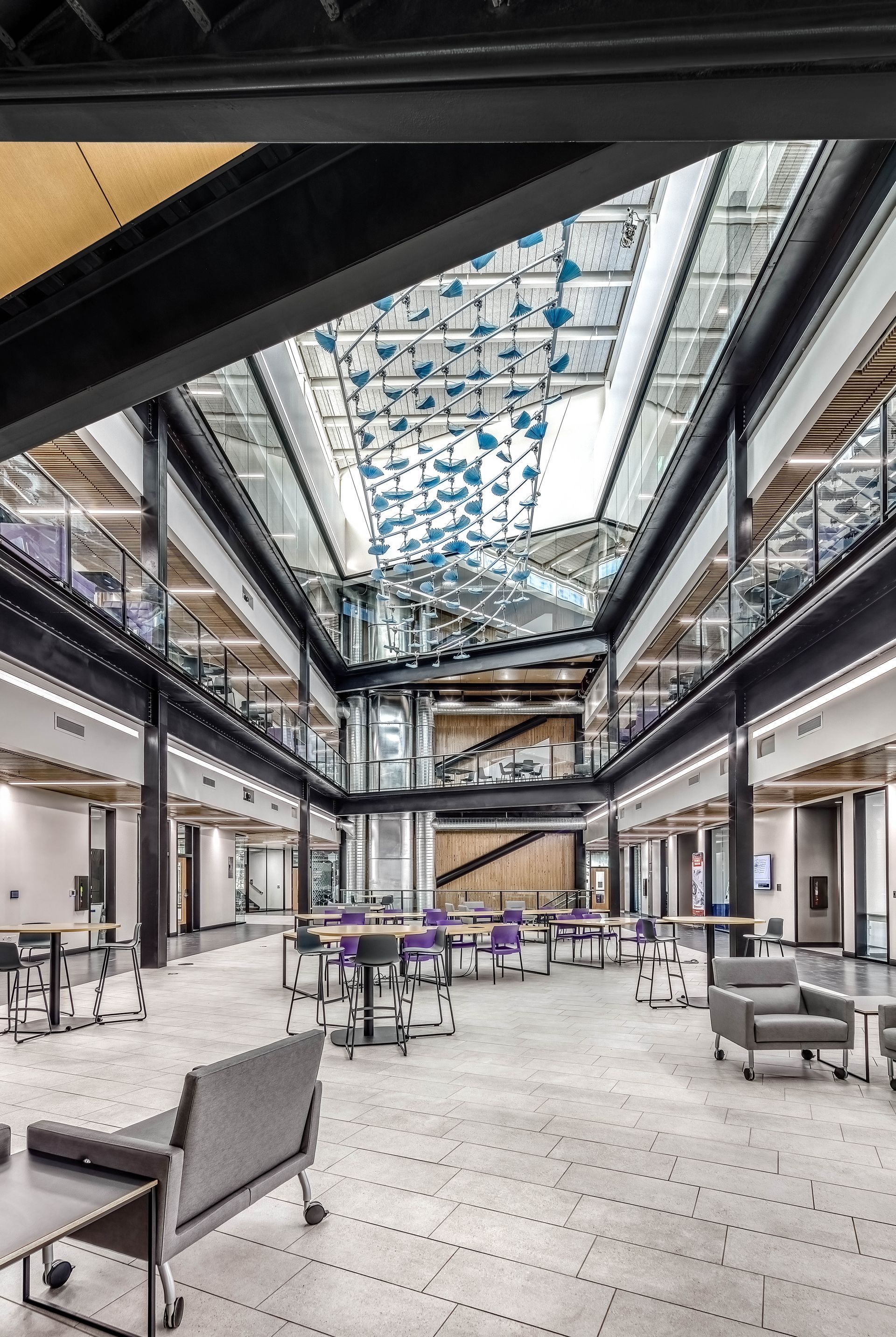 Clerestory windows drop in hefty amounts of passive daylight from high above the forum and dapple light on the “Between the Currents” art installation hanging from the ceiling. The 7-foot by 17-foot installation is inspired by the invisible forces of nature, the hidden math behind them, and how unexpected beauty emerges when diverse sets of information converge. It consists of 119 moving origami elements hung from a floating frame, cycling through animations showcasing the underlying mathematics of wave forces in nature.