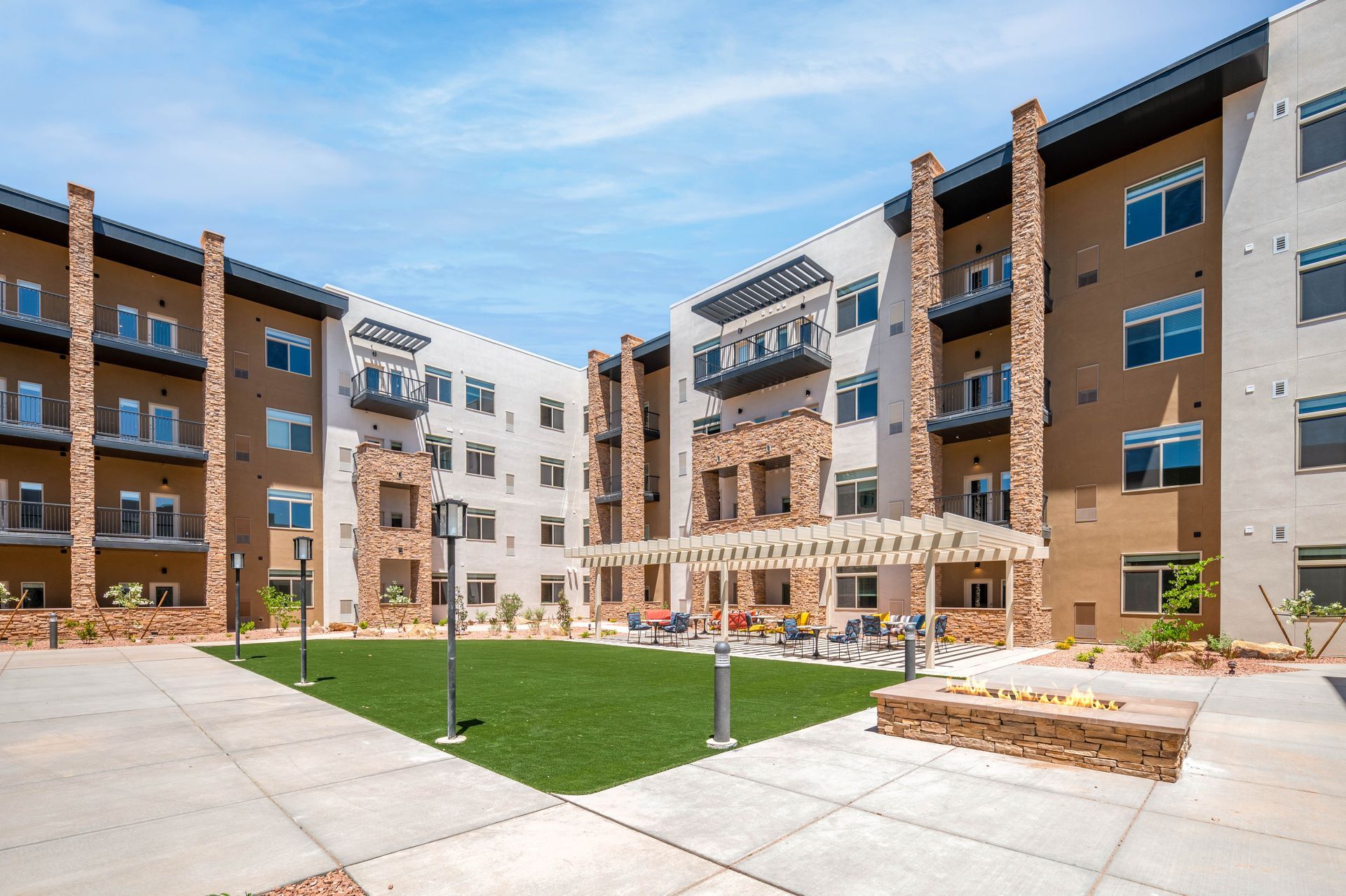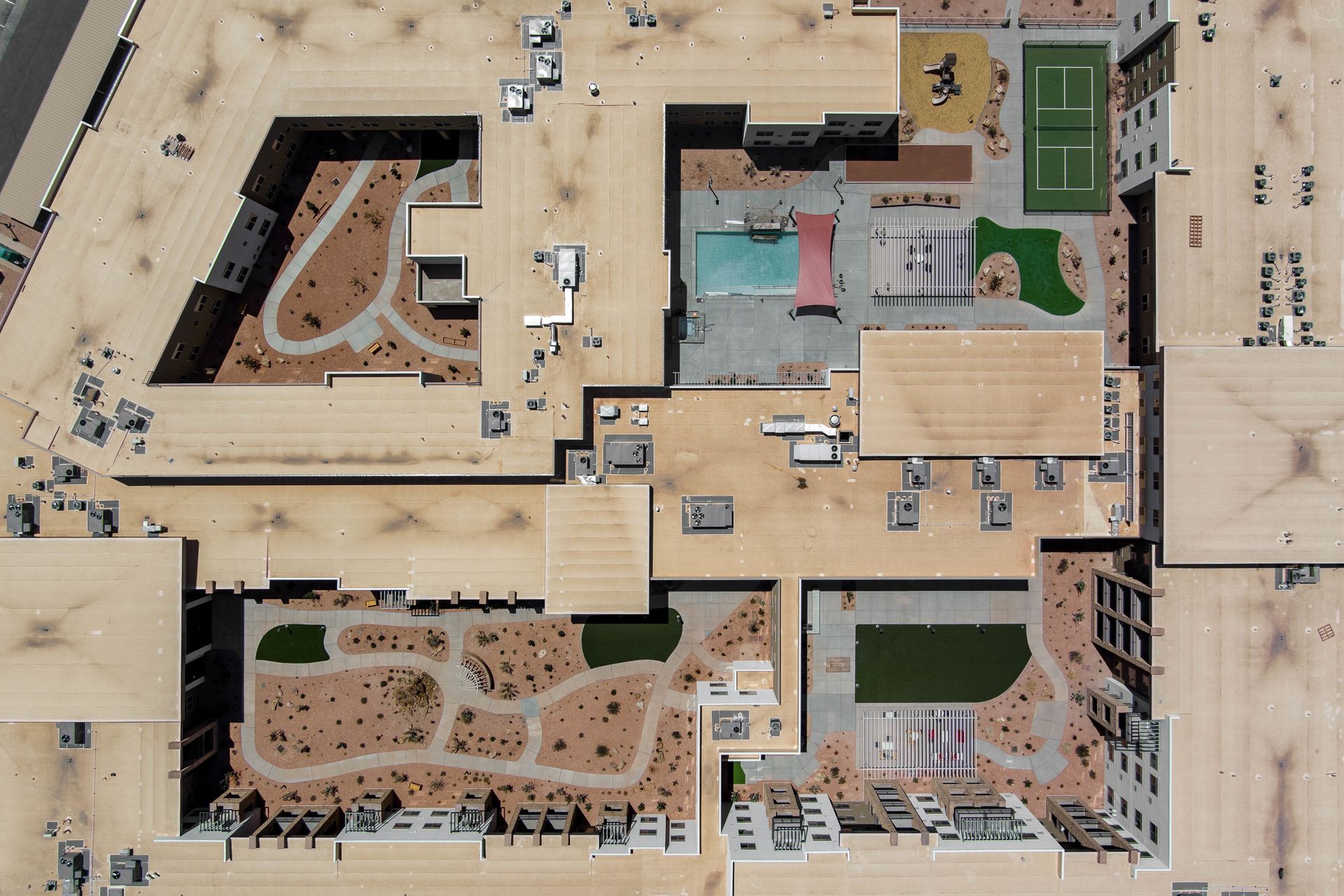 Key Outdoor Amenities: Four uniquely designed, open-air courtyards on the inside of the facility; pool/hot tub area; pickleball court and other outdoor game areas; waterfall feature; shaded outdoor areas; walking path around the facility; raised planters and water-wise landscaping.