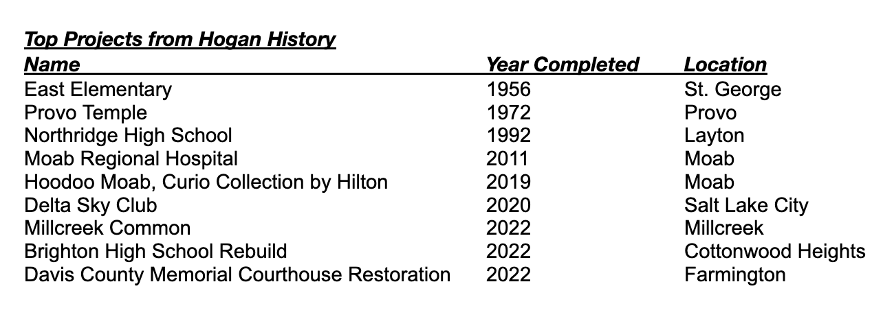The company became Hogan & Associates Construction in 1995 after Hogan and Tingey split, and continued to develop iconic projects in Utah, including South Davis Recreation Center, Moab Regional Hospital, and Millcreek Common.
