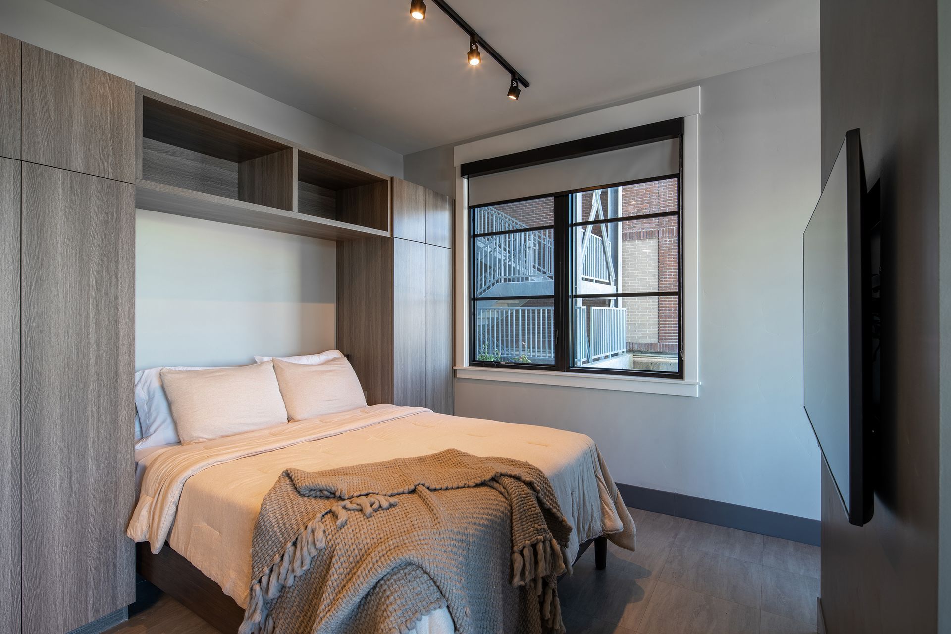 The project consists of three connected seven-story structures (five floors for residences, two for parking) and a separate, seven-story amenity building to the south. Among the three residential structures, two consist of “open” one-bedroom apartments, while the third consists of 150 furnished studios split between two masses connected via a communal space that form a U. What studios lack in square footage is made up for in community, lifestyle, and quality.