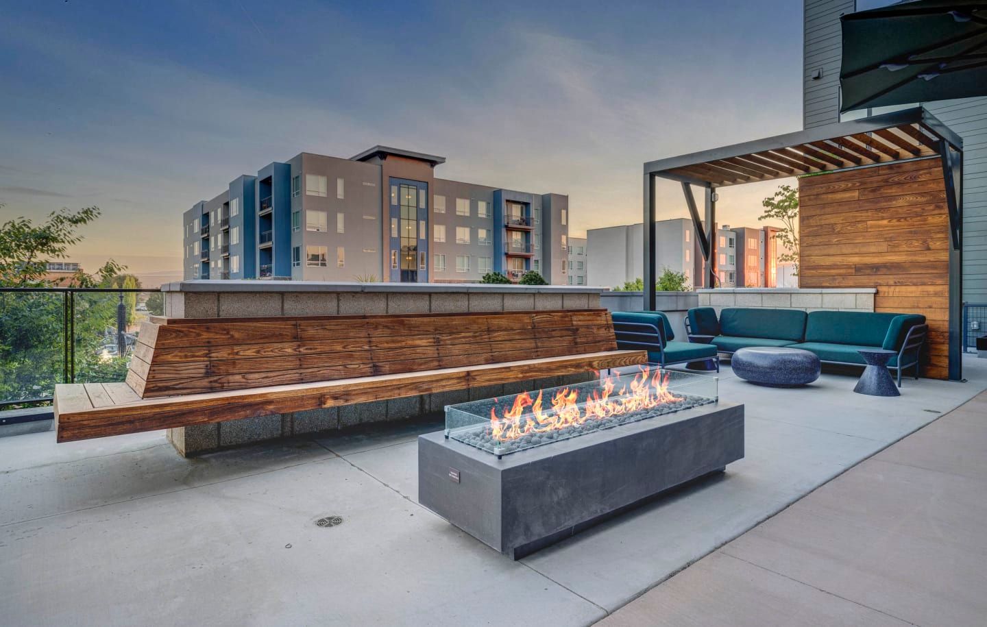 Community amenities rest on top of retail structure bump outs, one connected to Building A’s five floors of residences above one floor of concrete parking garage and the other connected to Building B’s five floors of apartments and two levels of parking garage. With design assistance from master amenity architect Loft Six Four, Pentalon constructed four-foot-tall, cast-in-place concrete planter boxes with flowering pear trees to create a privacy element for tenants on the rooftop floor and also a respite on sunny days. The plaza’s array of seating options, fire pits, festoon lighting, and BBQ areas are ready for future neighborhood parties.