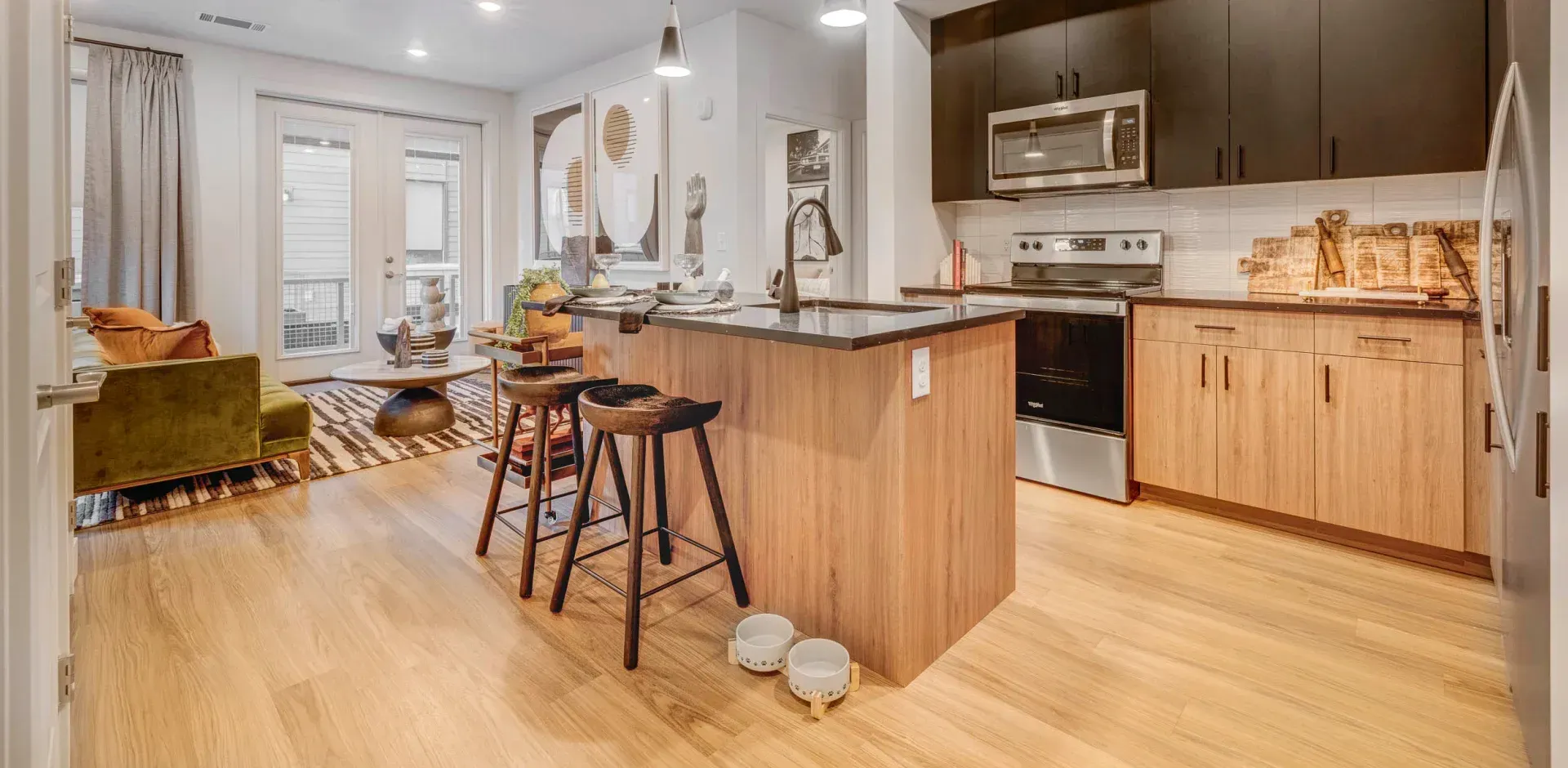 These amenity spaces and residences are great examples of design and construction expertise to build community. The exposed concrete slab sets a foundational tone, complemented by warm walnut, iron detailing, and vintage deco tile. Painted drywall, wood trims and doors, LVP flooring, tile backsplashes and showers all come standard across the modern studio, one-, two- and three-bedroom residences.