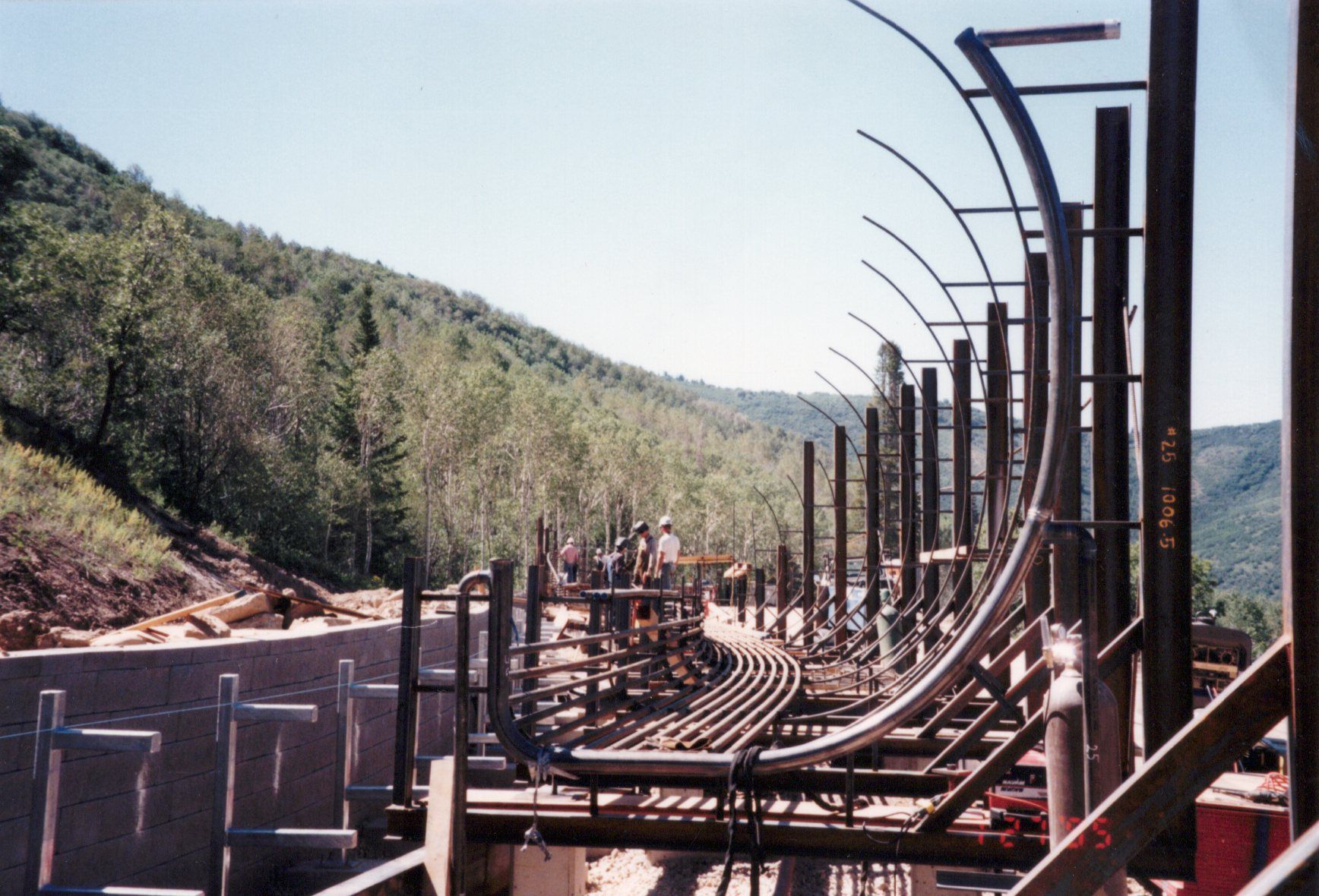 For the piping system, we had to build a jib in the shape of the run, and every 20 feet, there was a metal jib. We would follow with soffit forms, and the pipe crew would lay pipe behind it. Every section of track was different in mass, size, height; expansion joints were based on length of pipe. What made it tough was that on some of those [concrete] pours, we had to pour 300 feet of track. From when you started to when you were finished was 24 hours. The grout had to be perfect, as did your scraping. We did shotcrete by hand and then pull the board off. That was the toughest job I ever did physically."