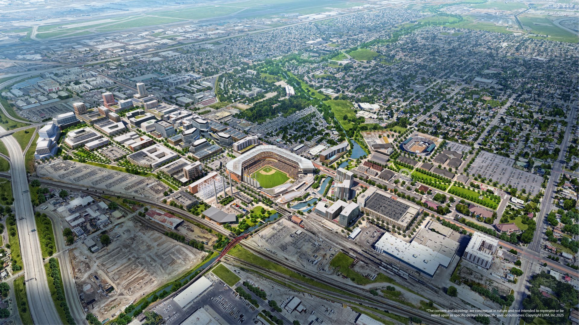 Aerial rendering shows what the “The Power District” could look like—with a Major League Baseball stadium as the crown jewel of the proposed 100-acre-plus development. (courtesy LHM Real Estate)