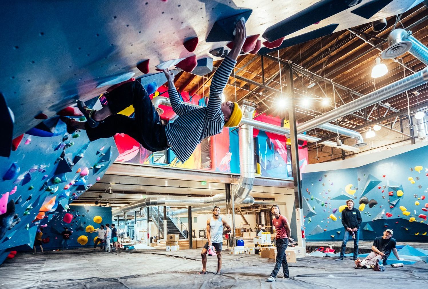 Fortunately, Day said, the warehouse property lent itself well to the objective. Although combined over the years, the warehouse is still clearly comprised of five separate buildings, each with its own style. So, the team took advantage of the site’s quirks. The Bouldering Project would go in the newest section, which featured block walls and steel trusses from the 1950s, while the retail space was assigned an older portion of the building with exposed brick and gabled wood trusses.