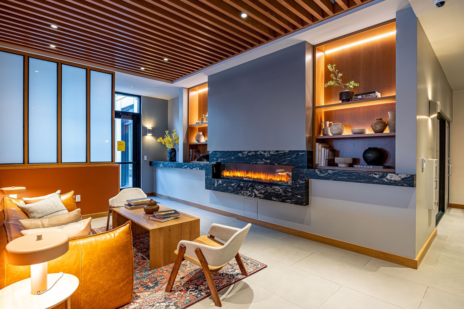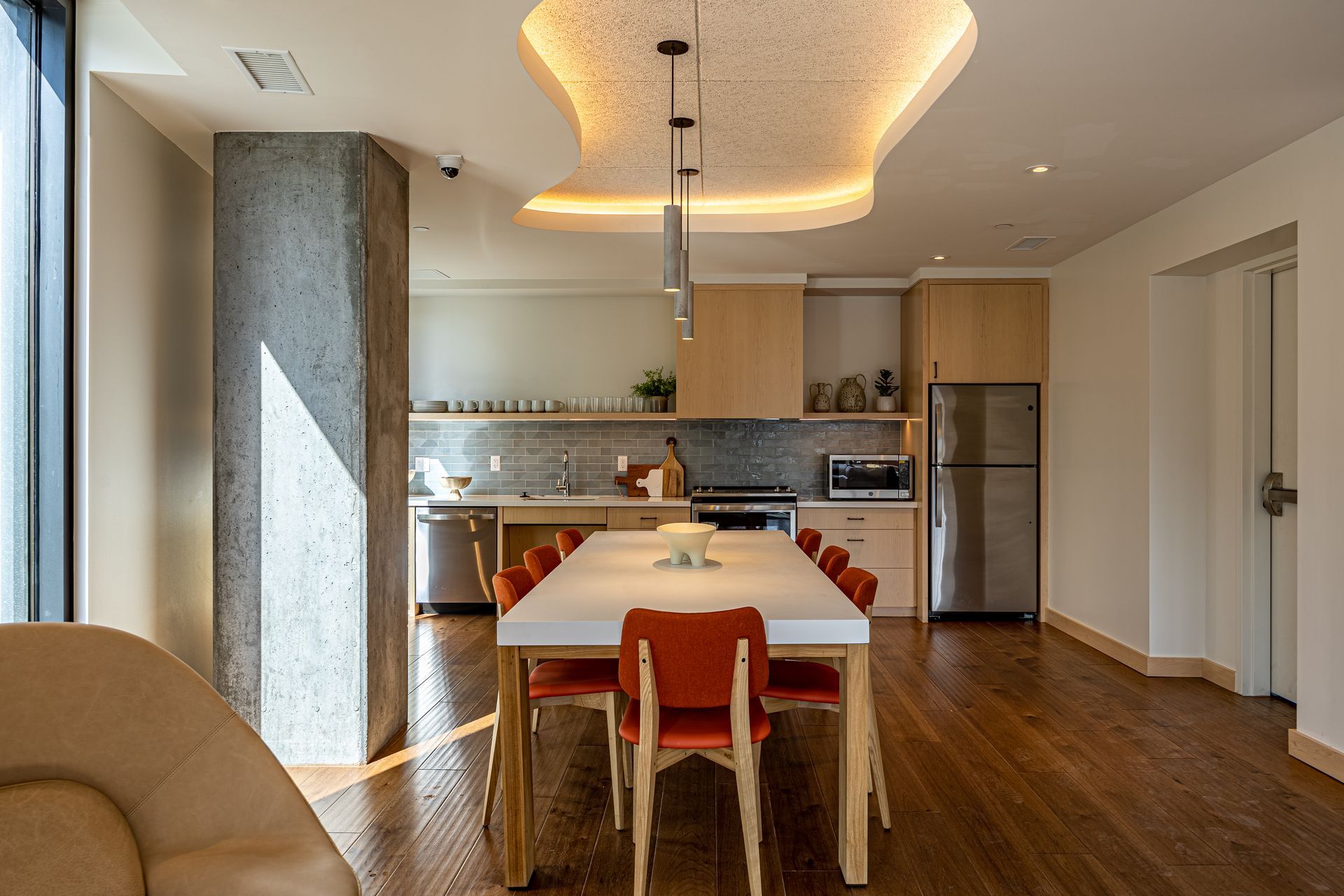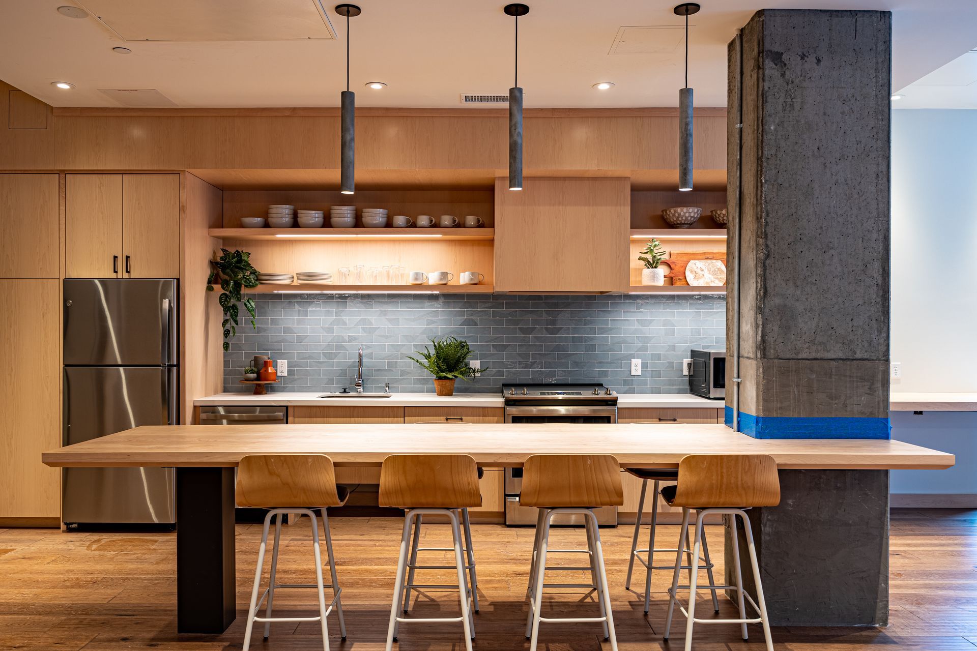 To create an appealing living space, interior community areas have a kitchen and plenty of seating for friends, family, and neighbors. Brilliant daylighting throughout the project combines well with the wood grain in cabinetry and elsewhere to draw out a homey level of comfort. Colorful BAUX wood wool panels in the two community rooms add an energy that matches the same lighting features found in the lobbies.